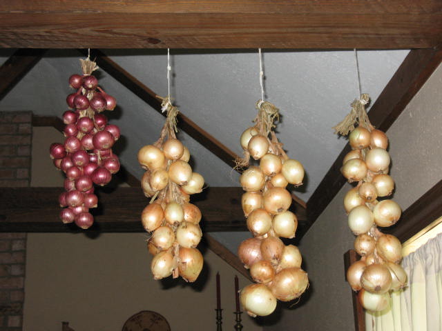 After picking I brush the dirt off on the onions and lay them out on a table under my porch to cure for a week or two. When they are cured and the tops are pretty dry, I braid the onions into strand about a foot and a half long, tie the ends with string, and hang the braided strands from the beams in our living room (I know, it sounds weird, but it doesn’t look that strange in our country home). Pictured Below: Onion braids hanging from a livingroom beam.