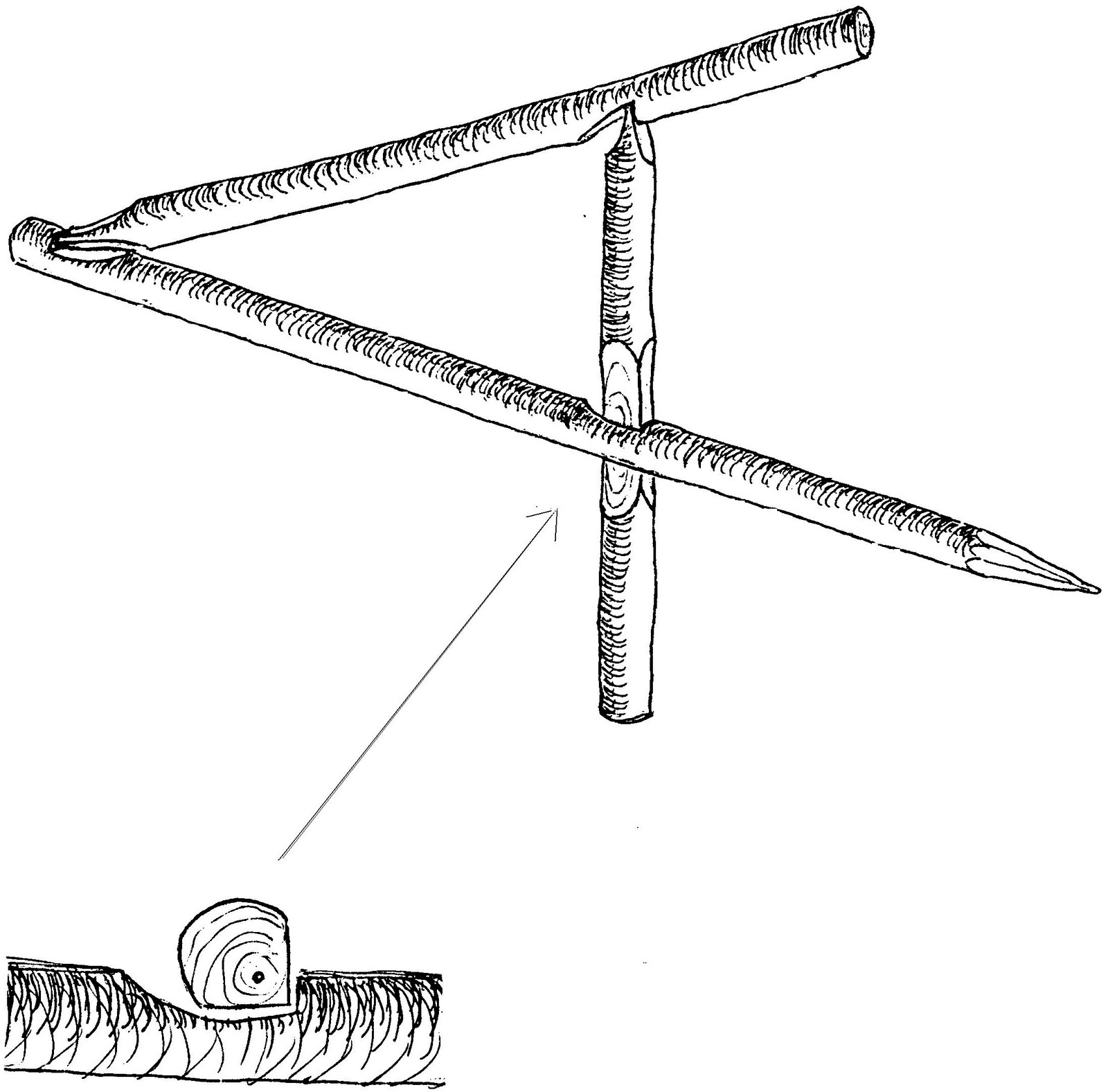 The bait stick is wedged in between the small cross stick and the deadfall itself. When an animal disturbs the bait stick, it slips off of the small cross stick and allows the deadfall to drop. All pieces of the Paiute trigger should be prepared following the same procedures as for the figure four trigger. That is: