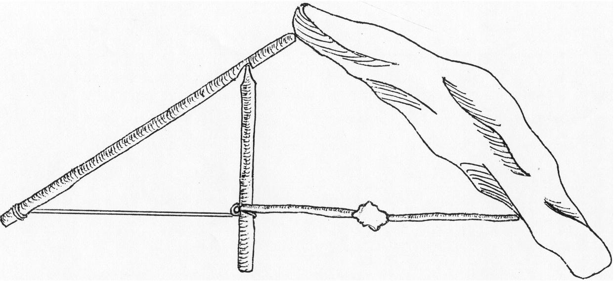 Instead of a solid stick, the Paiute trigger uses a piece of cordage tied to the bottom of the diagonal. The cordage, which has a small cross stick tied to the other end, is then wrapped once around the upright stick, and braced in place with a bait stick.