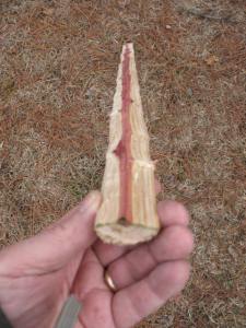 I decided to make my bow from what we call cedar in East Texas (it’s really juniper). I selected juniper because it is fairly easy to work, it is readily available, and it has fairly good cast even when it is green. The down-side is that it is pretty brittle, and I would never make a cured bow of juniper unless I was going to put some kind of backing on it. This bow will probably work well for a while, but after it dries out it will probably break. But hey, the whole point is to simulate a survival situation where I make a quick workable bow that will last for a few days, or maybe a week. So, cedar it is.