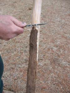 One reason that I selected a fairly small stave is that I didn’t want to have to remove a lot of wood in making the bow. Remember…….. limited time and tools. I turned out that the stave was just right. I was able to use my hatchet like a splitting wedge and split the stave cleanly. I stood the stave up on end, placed the hatchet blade across the end, and used a piece of wood to tap the hatchet/wedge down through the stave. Cedar is a straight grained wood, so once I got it going it continued to split right down the middle. Pictured below: Scraping bark from stave.