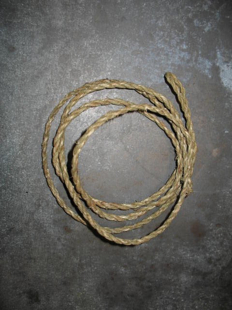 Now to make the bow shootable I needed a bow string. I walked back to where I knew a yucca plant was growing and cut about ten leaves off of it. I split the leaves into strips of fibers a little less than a sixteenth of an inch thick, and twisted the fibers up into a bowstring. For directions on how to make a bowstring see my post for Feb. 24, 2009. Total time to gather yucca, split it, and twist up the bowstring: one hour and thirty minutes. Pictured below: Yucca plant, yucca leaves, splitting yucca leaves into fibers, twisting up yucca fibers, and finished yucca bow sting.