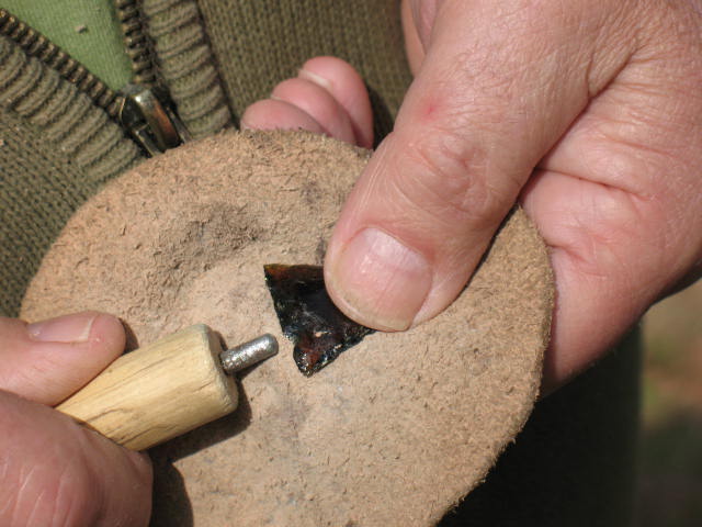 Once you have roughed out the shape of your point, it is time to bring out the pressure flaker and start working down to your finished point. Most knappers do their pressure flaking with a deer antler tine or a piece of large guage copper wire mounted in a wooden handle. I personally use deer antler because that’s what I’ve got. You’ll also need a palm pad to protect your hand while you’re pressure flaking. I use a piece of heavy leather, like belt leather. The pad is oval shaped and a little bigger than the palm of my hand. The leather needs to be flexible so that you can close the pad around the piece that you are knapping and hold it tight. Shown below: Pressure flaking tools.