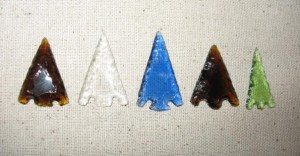 By the way, I have since learned that Native Americans used glass, when they found it, to make some of their points. Ishi, the famous “last wild Indian” made beautiful points from broken bottles, so this is not just some modern invention. Shown below: Finished glass points.