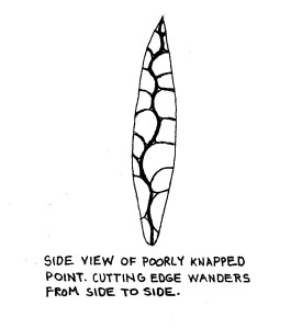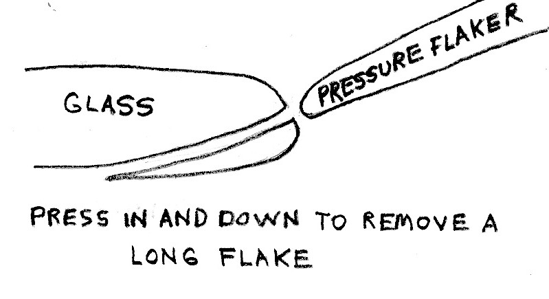 It takes practice, but that’s why you’re using glass, so you can practice. If you have a thin edge, pushing in and down may crush the edge rather than taking off a flake. You can prevent this by rubbing the edge on a piece of sandstone to grind it flat, and then using your pressure flaker to take off a flake. Turn your point up on edge and look at it frequently. You want the cutting edge of the point to run straight and to be centered. In other words, remember to flake both sides of the edge. Show below: Top: Improperly knapped edge; Bottom: Properly knapped edge.