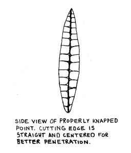 When you pressure flake, you need to be fairly precise on where you remove a flake. Pressure flaking is how you will finish out the shape of the point and how you will straighten out the edge of the arrowhead so that it is sharp and will penetrate well. You want to try and make your flakes long so that you will not be left with a bulky point that’s fat in the middle. The trick to pressure flaking is to push in and down on the edge. If you just push down you’ll end up taking off a short flake and you’ll have a point that’s fat in the middle and then drops off at a too steep angle to the edge. Pictured below: How to take off flakes so that you keep the edge centered.