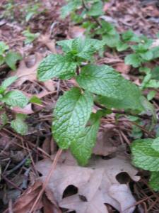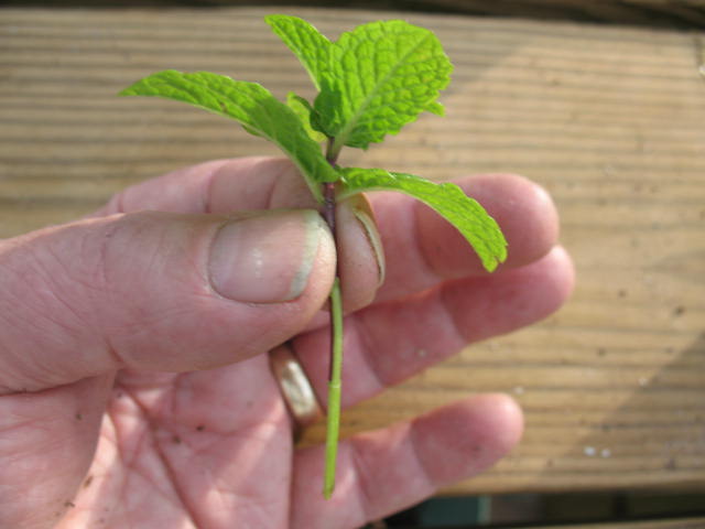 Second, find the plant that you want to propagate and take a cutting. You want to take a cutting of healthy, new growth off of the tip of a stem. Don’t cut an older woody stem. I generally make my cuttings about 3 inches long. Remove any leaves from the bottom inch of the stem, and use your fingernail to scrape off the skin from the stem. You don’t have to get every bit of the skin off; just drag your nail down a couple of times. Pictured below: Mint plant and cutting from mint.