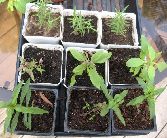 Place your cuttings a warm sunny place and keep the soil moist but not waterlogged. In a week or so you will begin to see some growth. Keep your cuttings in their original pots, or repot them if necessary, until time to plant. If they will be in the pots for a while, you may want to feed them with a little liquid fertilizer like miracle grow or maybe a manure tea. Pictured below: Rosemary, Thai Basil, and Lemon Mint Marigold all propagated from cuttings.