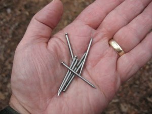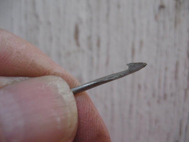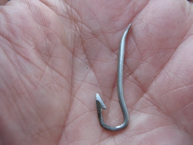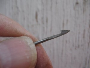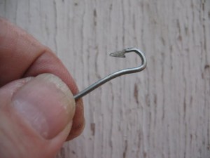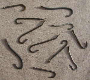 Steel nails can be used to fashion hooks, although sometimes nails are too hard. Again, you can do a little amateur blacksmithing by heating the nail until cherry red, then bending it, and hammering down the end for a barb. A lot of work for one fish hook. It will definitely make you wish that you had bought a few hundred ready made hooks. When I was a kid, we used to catch small fish on a bent straight pin. I haven’t tried that in a few years (like 50) but it might be fun to try again. Pictured below: Nails for hook making.