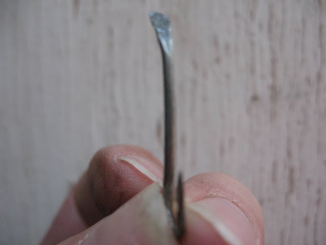Do you need an eye on your hook? Not really. Many old time hooks did not have eyes. All you really need to do is wack the end of the shank a couple of times to spread the metal out a little. Pictured below: Shank flattened out and ready for line to be attached, and the finished hook.