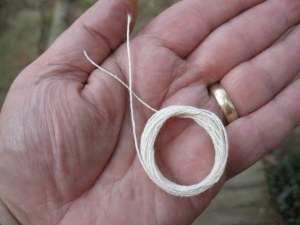 Once you have a hook, you need a line. Almost any small string will do as long as it’s strong enough to hold a fish. I usually use some small linen twine, but you could use nylon string, bailing twine, or even dental floss. If the string is too big you can unravel it into smaller strings. You will probably need about fifteen or twenty feet of line. Pictured below: Linen fishing line.