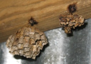 Another good source of bait is wasp larvae. My granddad used to grab a bunch of broom grass, light it with his cigarette lighter, and hold it up to a wasp nest to chase the adult wasps off. He’d then knock the nest down and carry it with us to the pond. We’d remove the larvae from the nest as needed and use them for bait. Looking back on it I don’t know how he kept from getting stung. Pictured below: top, a red wasp nest; bottom, a black wasp or dirt dauber nest.