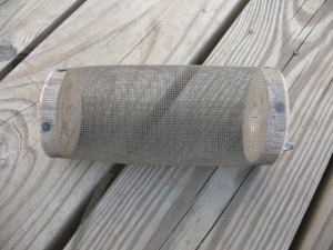 Next we took an old piece of screen wire and tacked it around the two wooden discs.