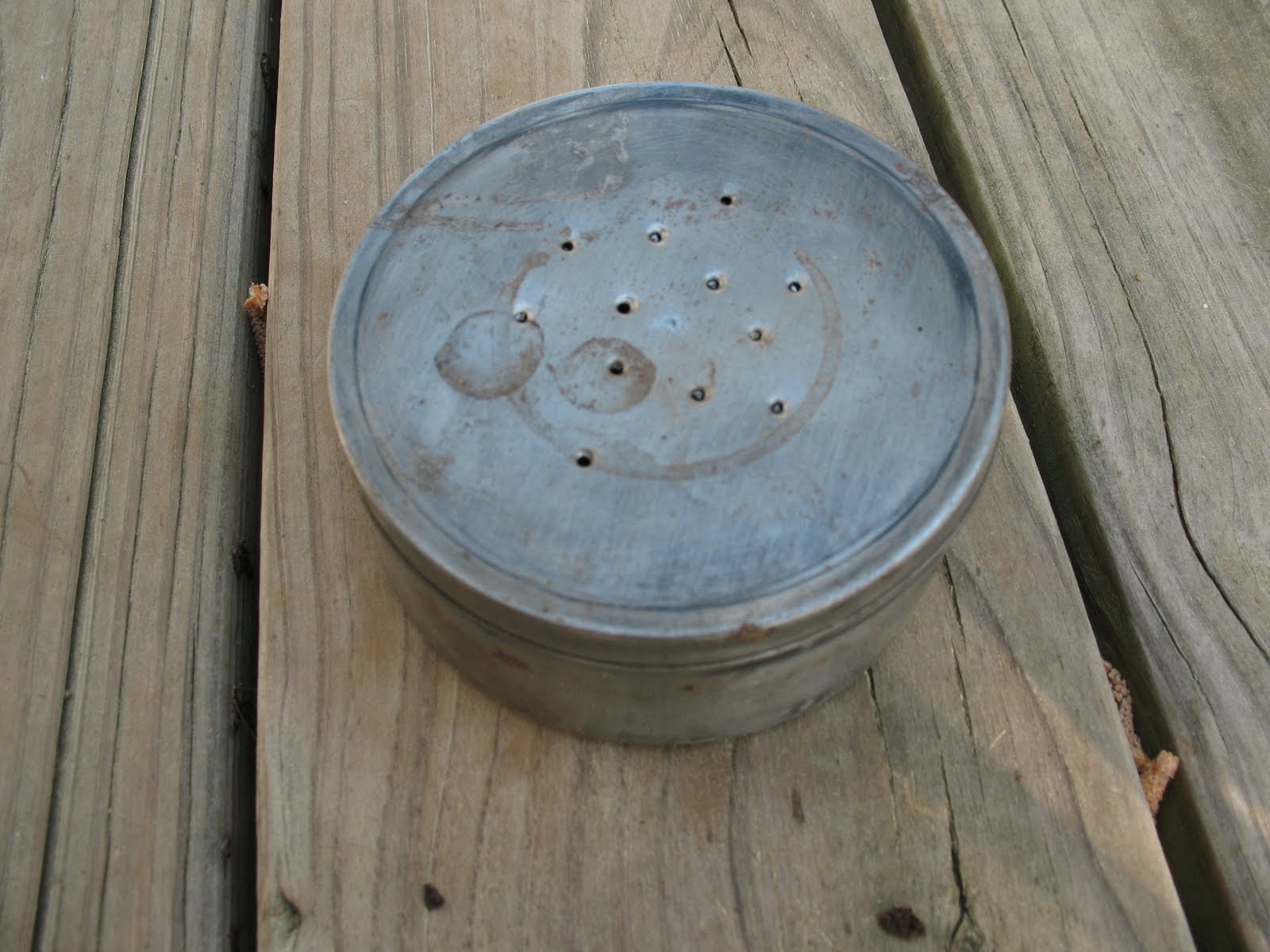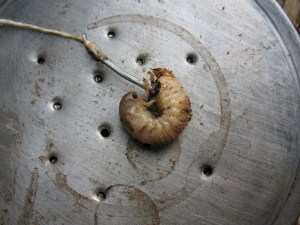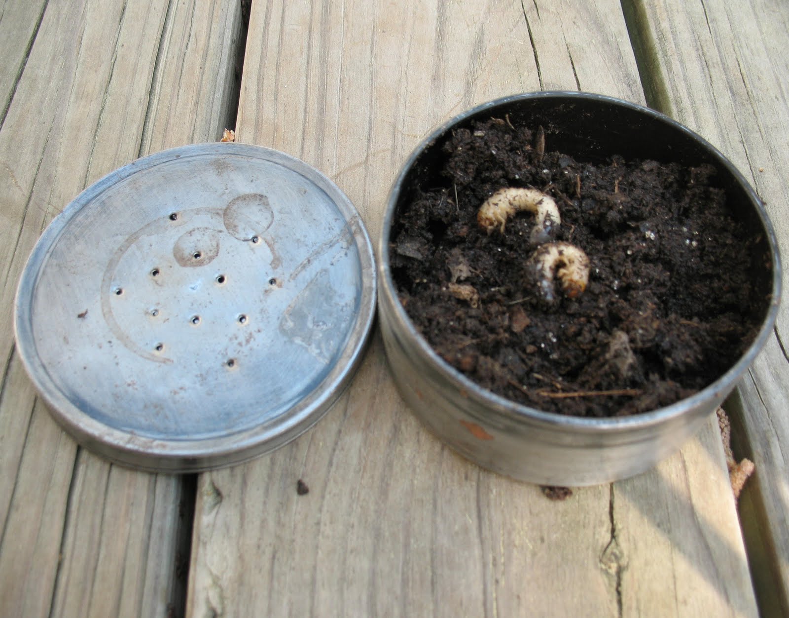 So now we’re down to where the rubber meets the road. Will my primitive fishing gear actually catch fish? Well it’s time to see. First thing I had to do was take my worm can and throw a few grubs from my garden into it. Pictured below: Closed worm can, and open worm can with grubs inside.