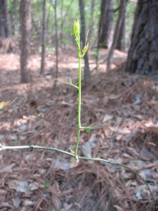 DISCLAIMER: Don’t believe anything I or any body else tells you about edible wild plants. Don’t eat edible wild plants based on what you see in a book or on the inter-net. Get a qualified instructor to show you the plants, and don’t eat them until the instructor shows you how to prepare them, and then eats them him or herself. Be aware that you may be allergic to a plant that someone else can eat without harm. Be sure that any plants that you gather have not been sprayed with pesticides or herbicides. Pictured below: Green Briar Vines