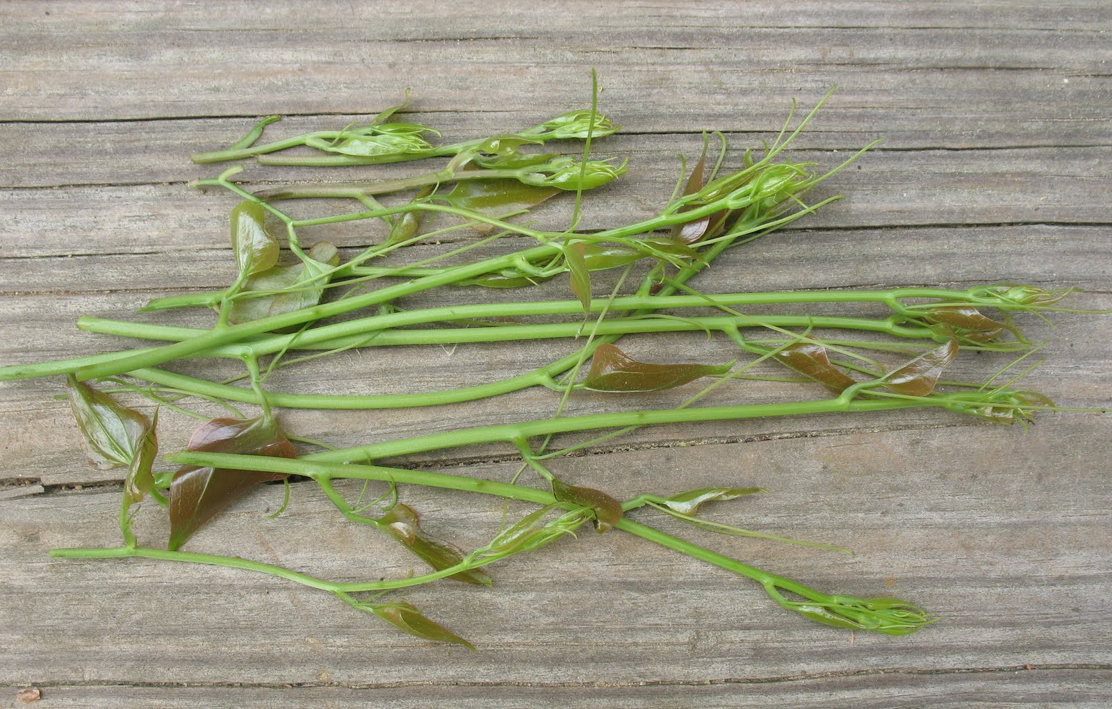 These young shoots can be pinched off of the vine, just above the first thorn, and eaten on the spot; or they can be collected and then steamed or boiled. They have a flavor kind of like green beans. If you have a little salt and pepper to add to them they are very tasty. Pictured below: Green Briar Shoots ready to eat raw or cook and eat like green beans.