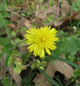 Most parts of the Dandelion (Traxacum officinale) are edible, but for right now we’re just going to talk about the greens. Dandelions are pretty easy to identify. The leaves grow in a rosette that is close to the ground and about three to six inches in diameter. The leaves are deeply toothed. In fact, the plant gets its name from the French dent d’leon which means “tooth of the lion.” In the center of the rosette the Dandelion puts up a shoot with a round yellow flower on it. Pictured below: Dandelion flower