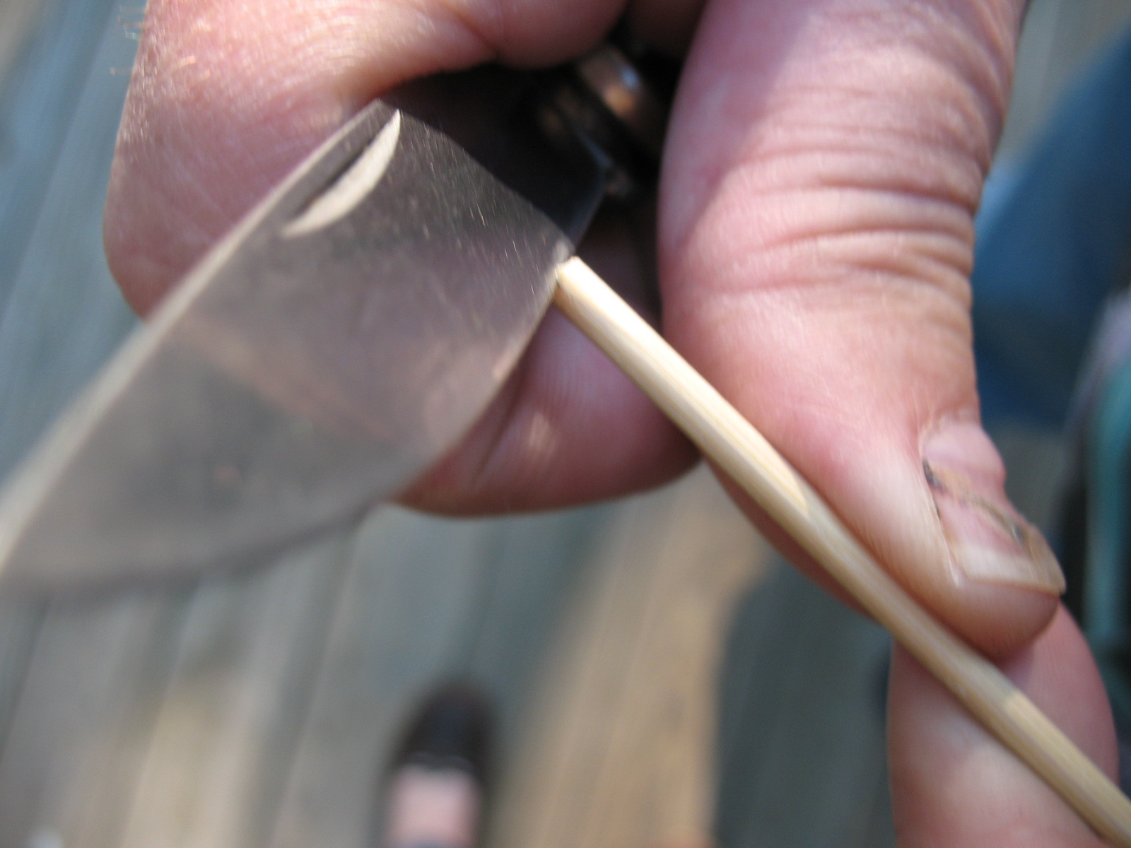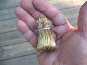 First we are going to attach the string to the dart shaft. Take a sharp knife and make a small split in the back end of the shaft. The split shouldn’t be too deep; maybe a half inch. Now take a piece of string (this can be linen string, kite string, a piece of yucca fiber, or anything of a similar size) and cut it about two feet long. Gently wedge the string down into the split that you just made in the dart shaft. Leave about an inch hanging out on one side of the split. Now set the shaft and string aside while you prepare the thistle. Pictured below: top, splitting top of dart shaft; bottom, string inserted in top of dart shaft.