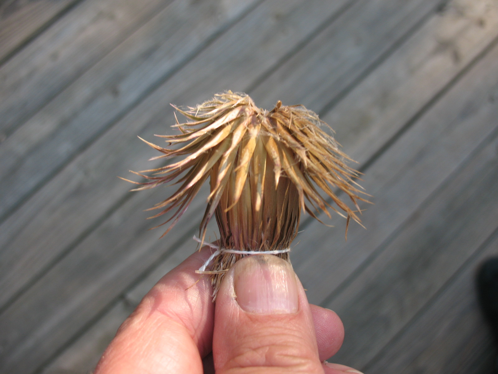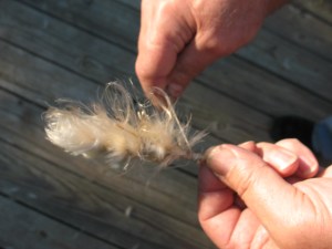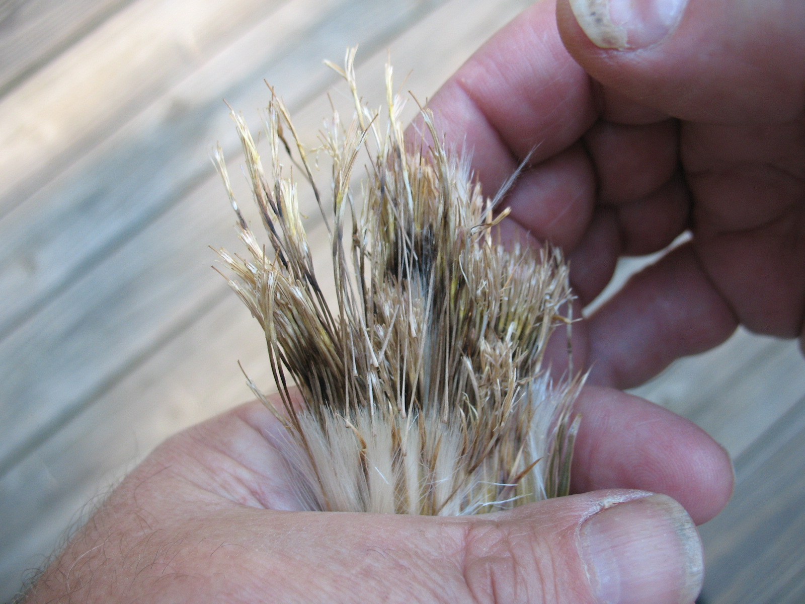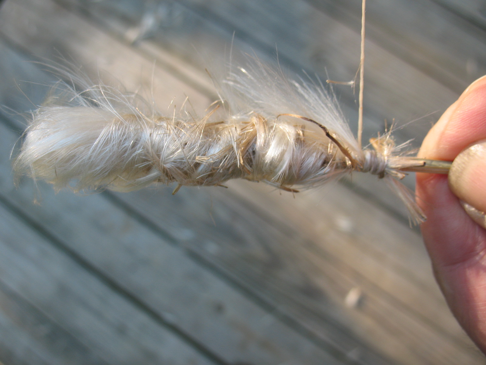Contained inside the thistle head are two kinds of fibers. One is the white down that you will be using. Interspersed within this down are some taller fibers that are more like stiff hairs with a tuft of brown fibers on the top. Pictured below: tall fibers and down.