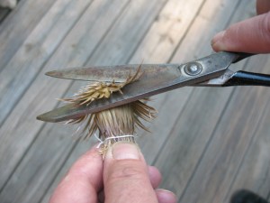 Select one of your thistle heads and cut away all of the spiny leaves around the base of it. Now cut loose the string that is holding it shut. Pictured below: top, untrimed thistle head; middle, removing spiny lower leaves from thistle head; bottom, trimmed thistle head.