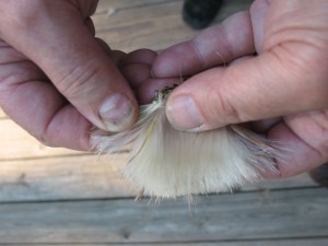Now the only thing remaining to do is to remove the base of the thistle head. Be sure that you have your fingers wrapped around the down when you pull the base off. Otherwise the down will break apart and fly everywhere. There may be some small seeds attached to the bottom of the thistle down. If there are, this is no problem. Just brush your finger gently across the seeds, and they will fall off. Pictured below: removing base of thistle flower.