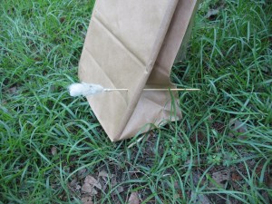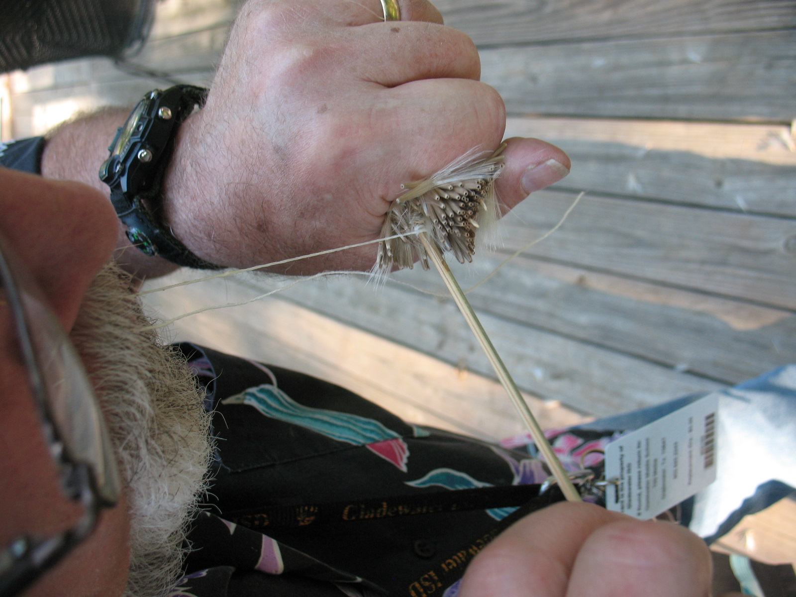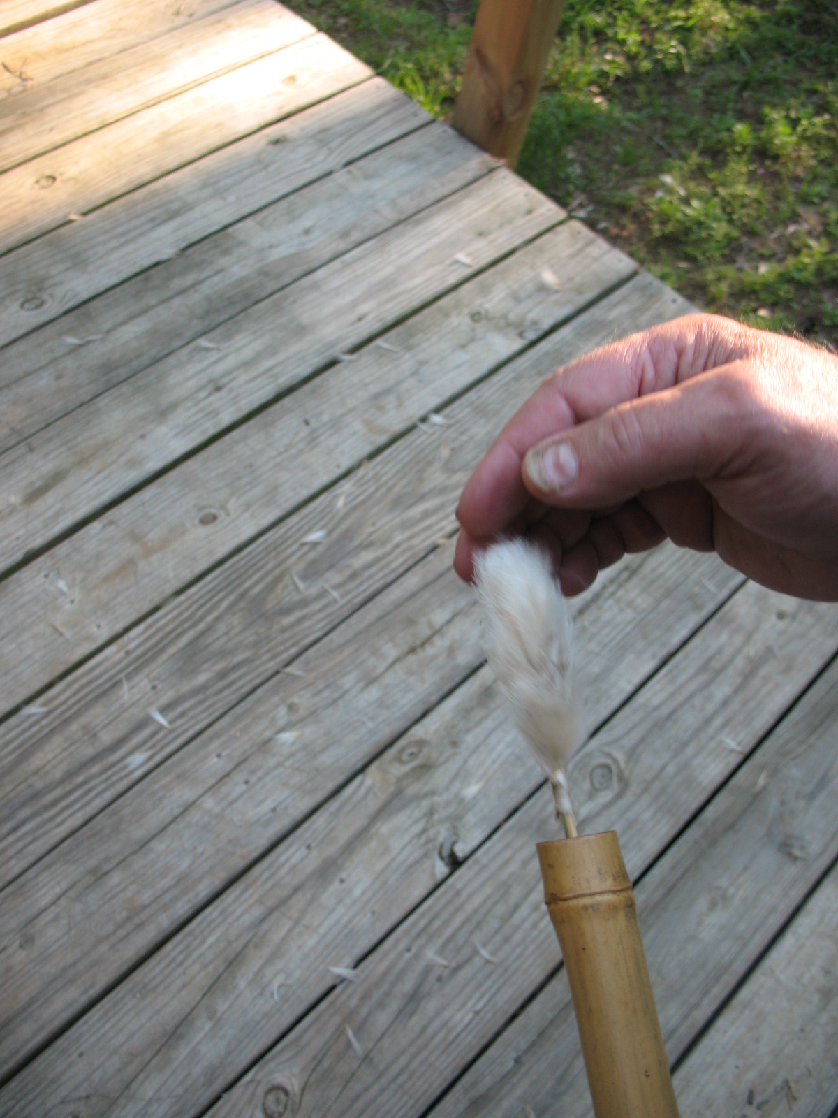Now to the business of attaching the thistle fletching to your blowgun dart. To give you an overview of the process, what you are going to do is spiral a string down the dart shaft, and as you are wrapping this string you are going to be inserting thistle fibers under it. The tightly wrapped string is tied of at the front end of the fletching and holds the thistle fibers in place. So let’s do it. Hopefully the pictures will help you understand this somewhat complicated process.