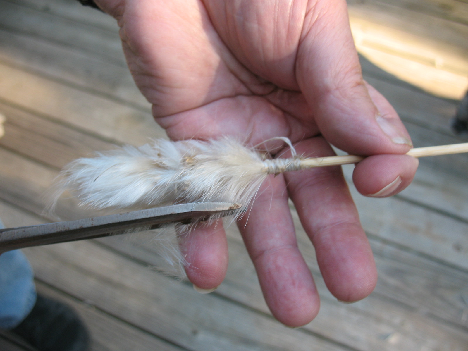 Slowly twist the dart shaft away from you. As the string wraps around the shaft, feed a small amount of the thistle down under the string. This takes practice. You have to feed the down in at a pretty consistent rate or you will end up with lumps of thistle in some spots and bare patches in other spots. Pictured below: Wrap in progress.
