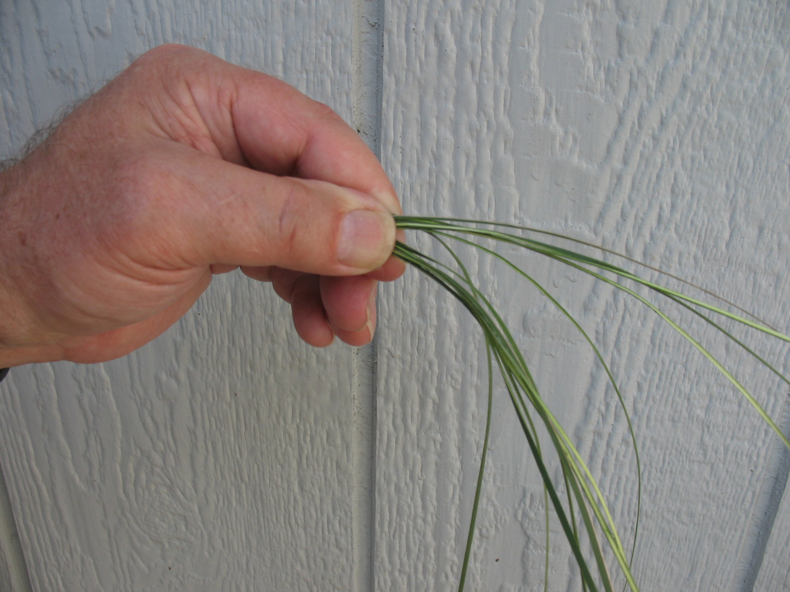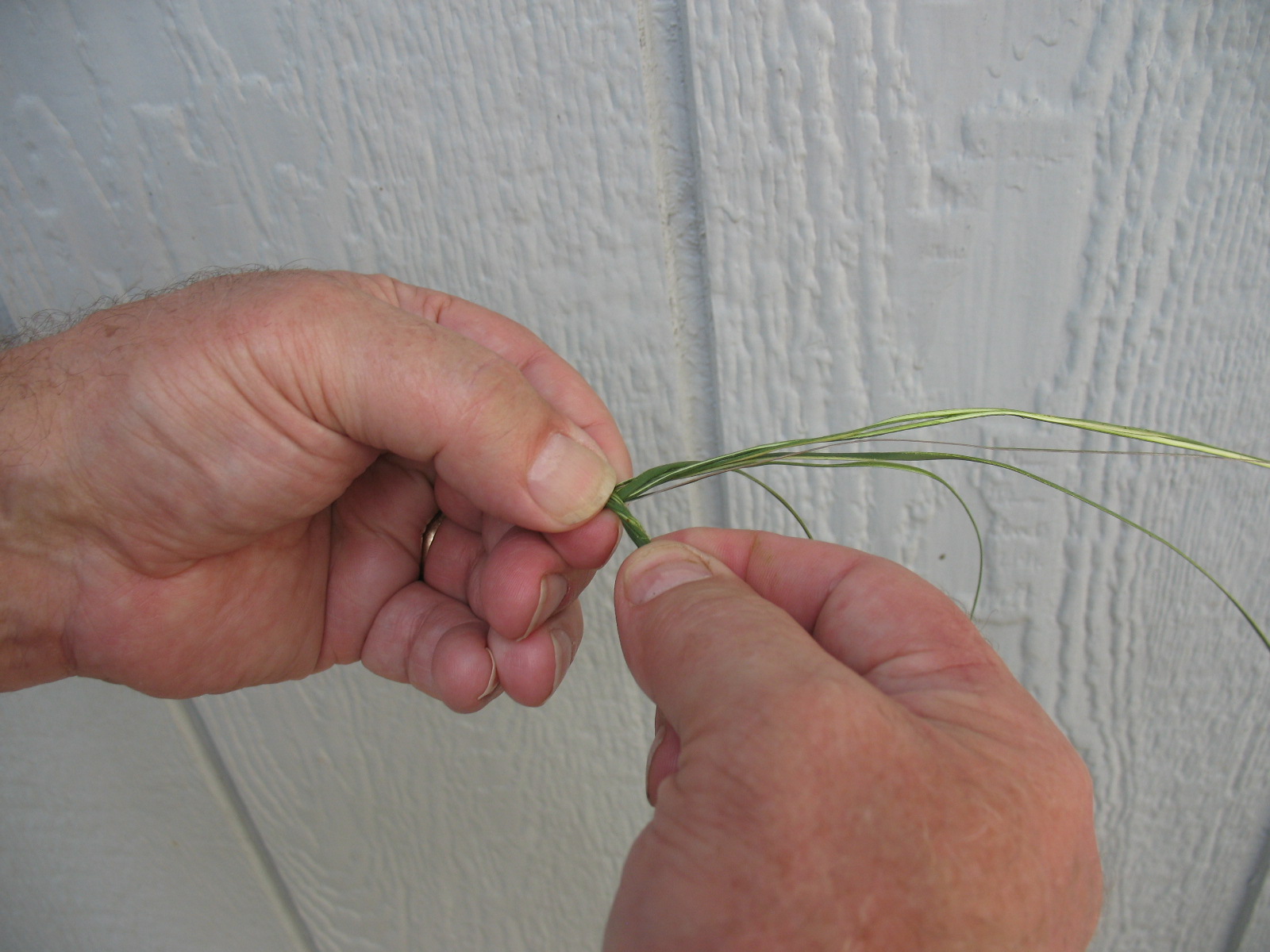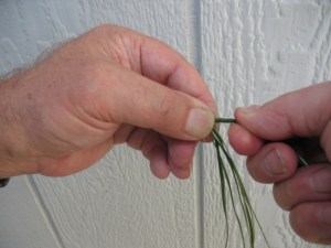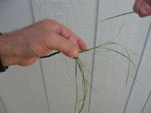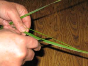 Now pick up all of the yucca fibers and fold them into a “U” shape with the points of the “U” facing to your right and the rounded part of the “U” pinched between your left thumb and index finger. (Note: these instructions are for a right handed person) Pictured below: Yucca fibers bent into “U” shape and pinched between thumb and finger.