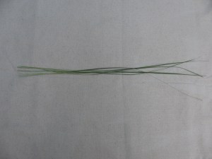 Decide how thick you want your finished cord to be and use half that number of fibers to start with. For example, if you want your finished cord to be as thick as 12 strips of yucca fiber, you will start out with 6 strips of yucca fiber laid out in front of you. All of the big ends of the fibers are on the left, and all of the small ends point to the right. Pictured below: six yucca fibers all facing the same way.