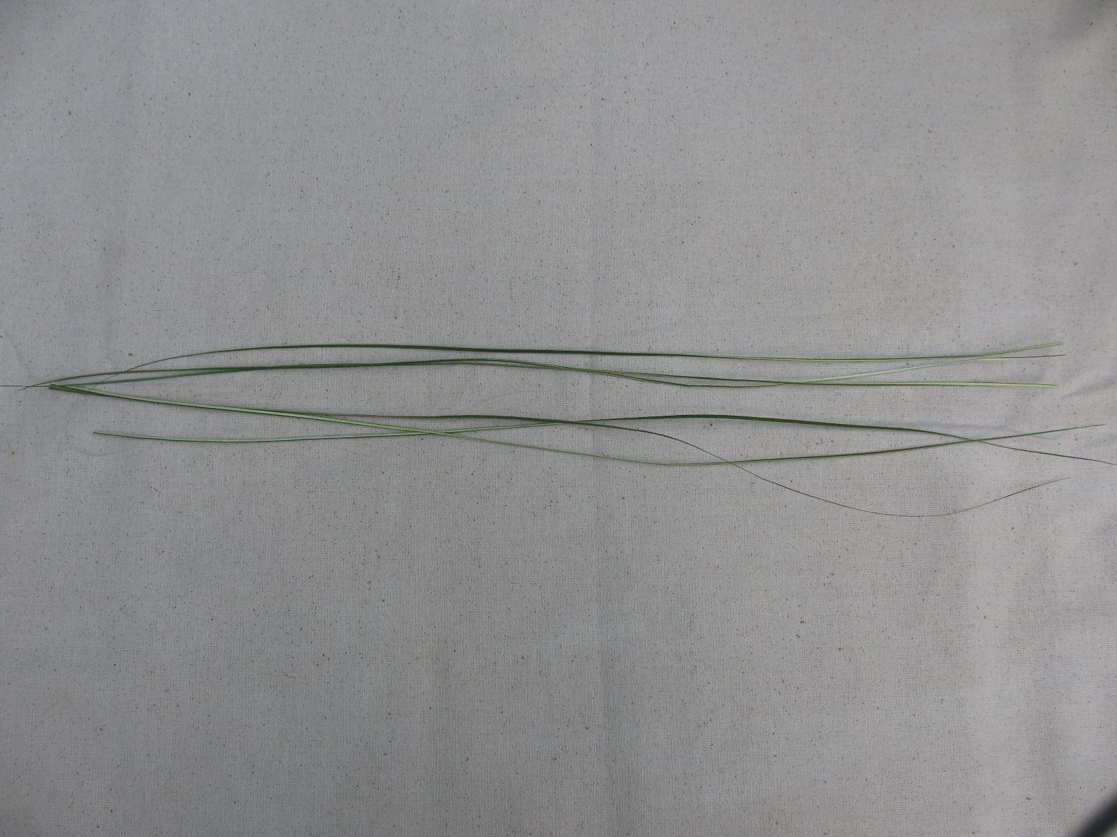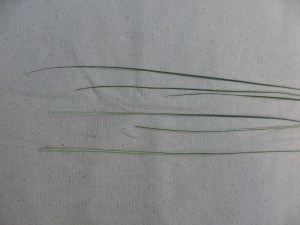 Now take 3 of your 6 strips and turn them so that the big ends are on the right and the points are to the left. Pictured below: Yucca fibers, half pointing left and half pointing right.