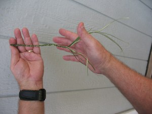 As you continue twisting away and pulling back, you will see a recognizable piece of cordage developing. You will also see that you are coming to a point where some of the fibers are ending. If you staggered the fibers correctly when you started, they should not be running out all at the same time. As you come to the first fibers that are running out, it is time to start splicing new fibers in. Pictured below: Time to splice in a new fiber.