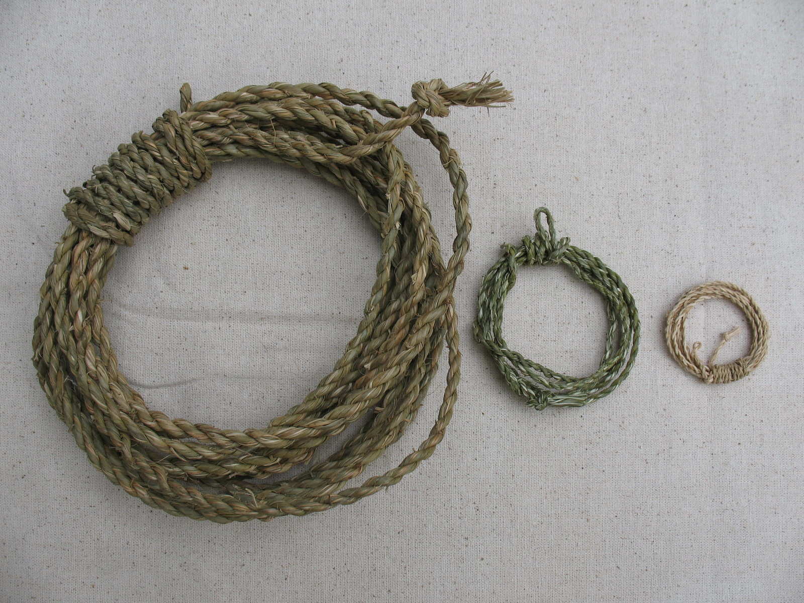 The same procedure is used for twisting up a fishing line, or a bow string, or a two-strand rope. The only difference is the number of fibers in each strand. Pictured below: Yucca rope, yucca bowstring, and yucca fishing line all made using the same reverse wrap technique.