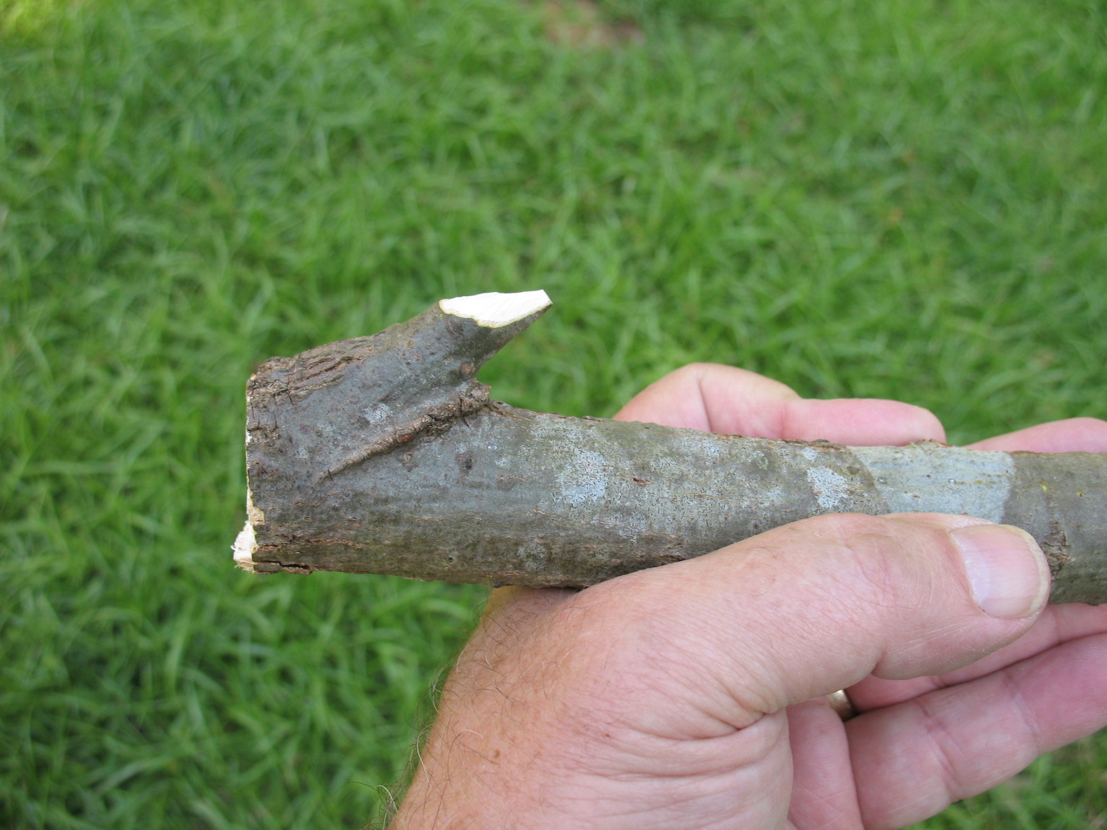 First let’s make the atlatl. We’re going to make a very plain-Jane survival type atlatl. The only tool you will need is a knife. First step is to locate a good tree branch for making your atlatl. The main part of the branch needs to be about an inch in diameter and straight for a length of about two feet. The bottom part of the branch needs to have a limb growing out of it at an angle of less than forty-five degrees. Picture below: A youg sapling with a branch coming of at the correct angle for making an atlatl.