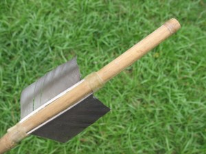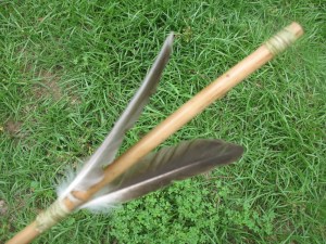 I make my atlatl darts out of river cane with a hardwood foreshaft. Select a straight piece of river cane that is about a half inch in diameter and four to five feet long. If the cane is not straight, you can use heat and bending to straighten it. I won’t go into any detail about this process as I have already covered it in my 1/28/2011 post on making quickie river cane arrows, and my 5/1/2011 post on making a river cane blowgun. In fact the whole process for making an atlatl tart is almost exactly the same as making a river cane arrow; just make the dart bigger.