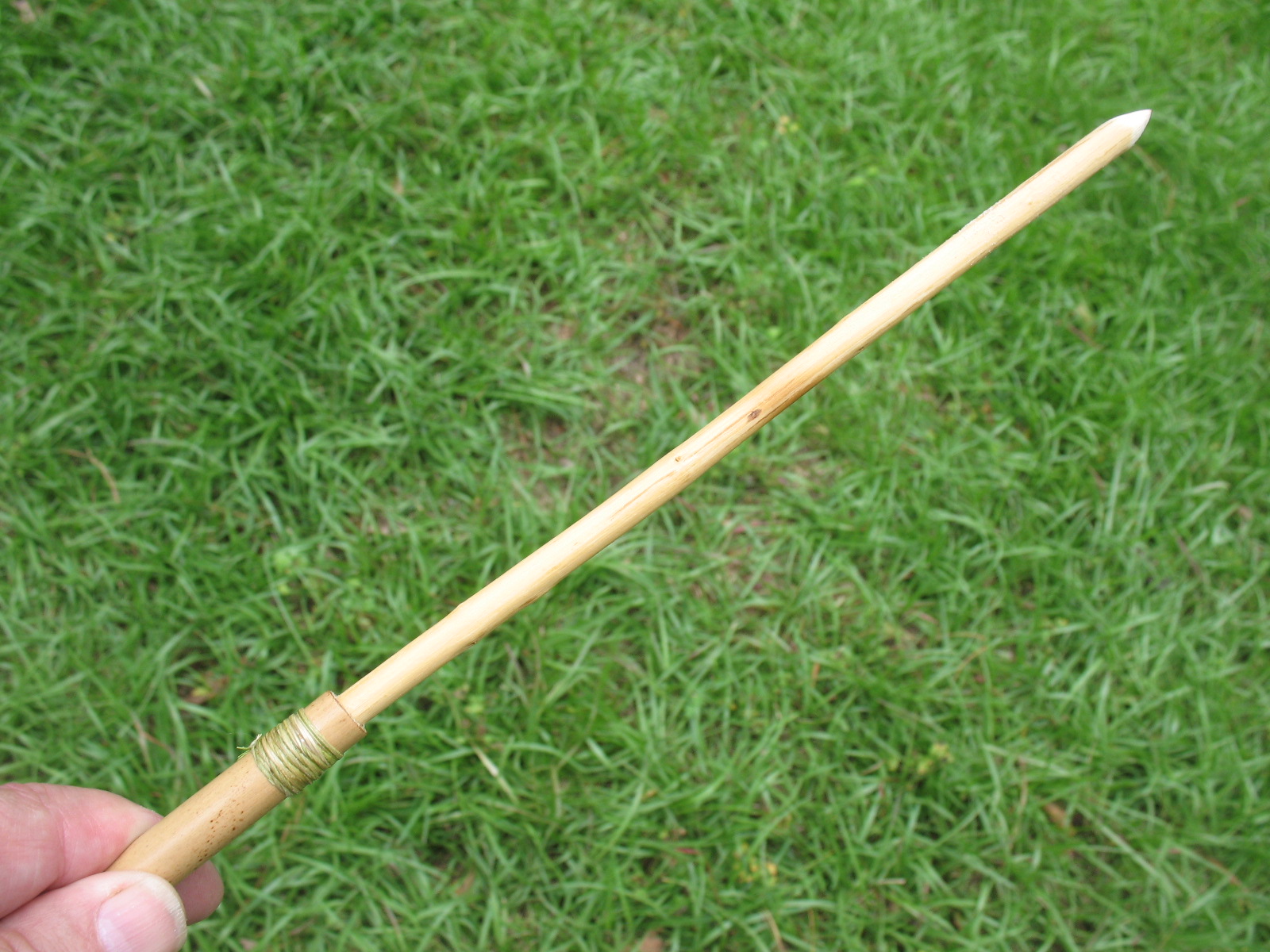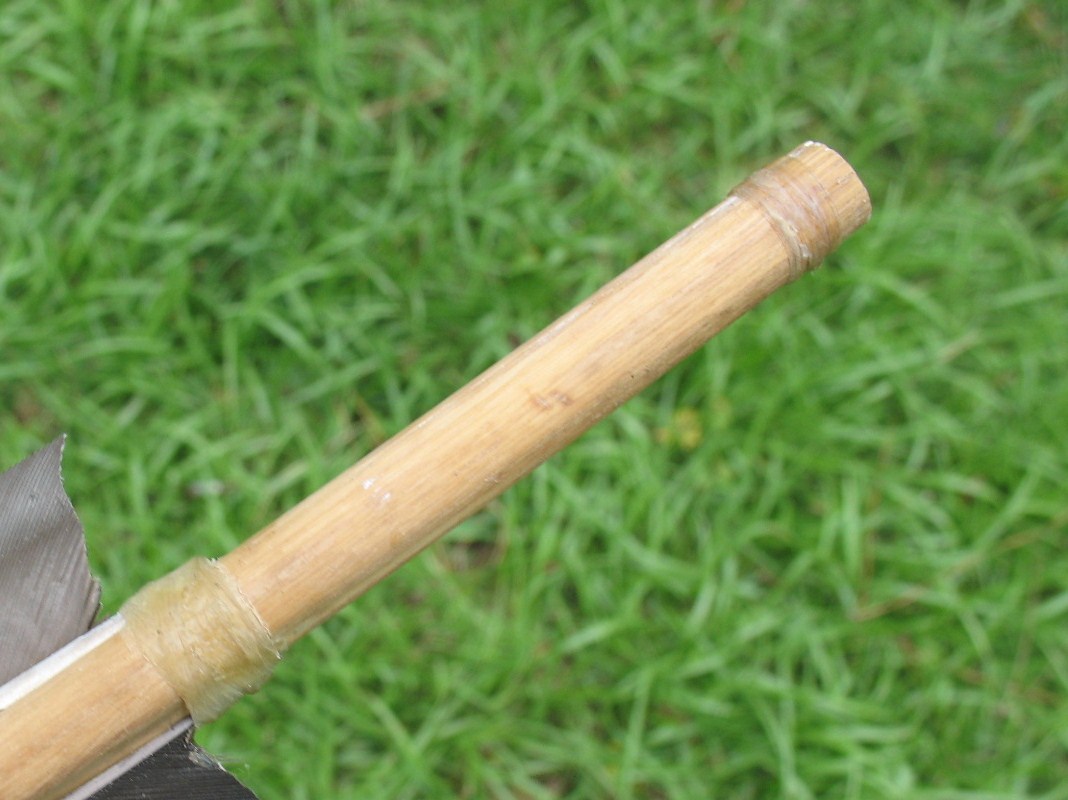 There is no string notch on the back of an atlatl dart. Your atlatl attaches to the dart by slipping the point of the little projecting limb into the hole in the back end of the cane. It is not a bad idea to reinforce the back of the cane with a few wraps of sinew or plant fiber. Pictured below: Rear nock reinforced with sinew wrapping.
