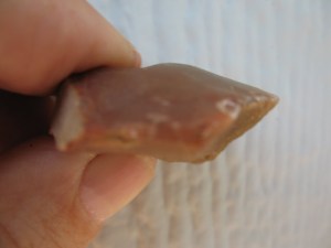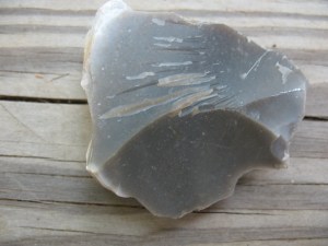 First the flint. I have started a fire with a tiny piece of flint no more than half inch by half inch, but we will start off with something a little bigger so you don’t mash up your fingers while learning how to strike the flint. I would recommend that you start of with a flint that is about two inches by two inches and maybe about three eights of an inch thick. Where do you find flint? Well, it’s not always easy to find. In my area (East Texas) there is none. At my sister and brother-in-law’s place in northern Arkansas it’s everywhere. You’ll just have to look around. Sometimes flint is used to grade railroad right-of-ways, and I have found some decent pieces of flint walking along train tracks. What you are looking for is a very smooth grained shiny rock that has an, almost, glass like surface. You can’t go by color because flint comes in white, tan, brown, yellow, gray, and black. Pictured below at the top are several different pieces of flint. On bottom is a close-up of a piece of dark gray flint showing the smooth, almost glass surface.