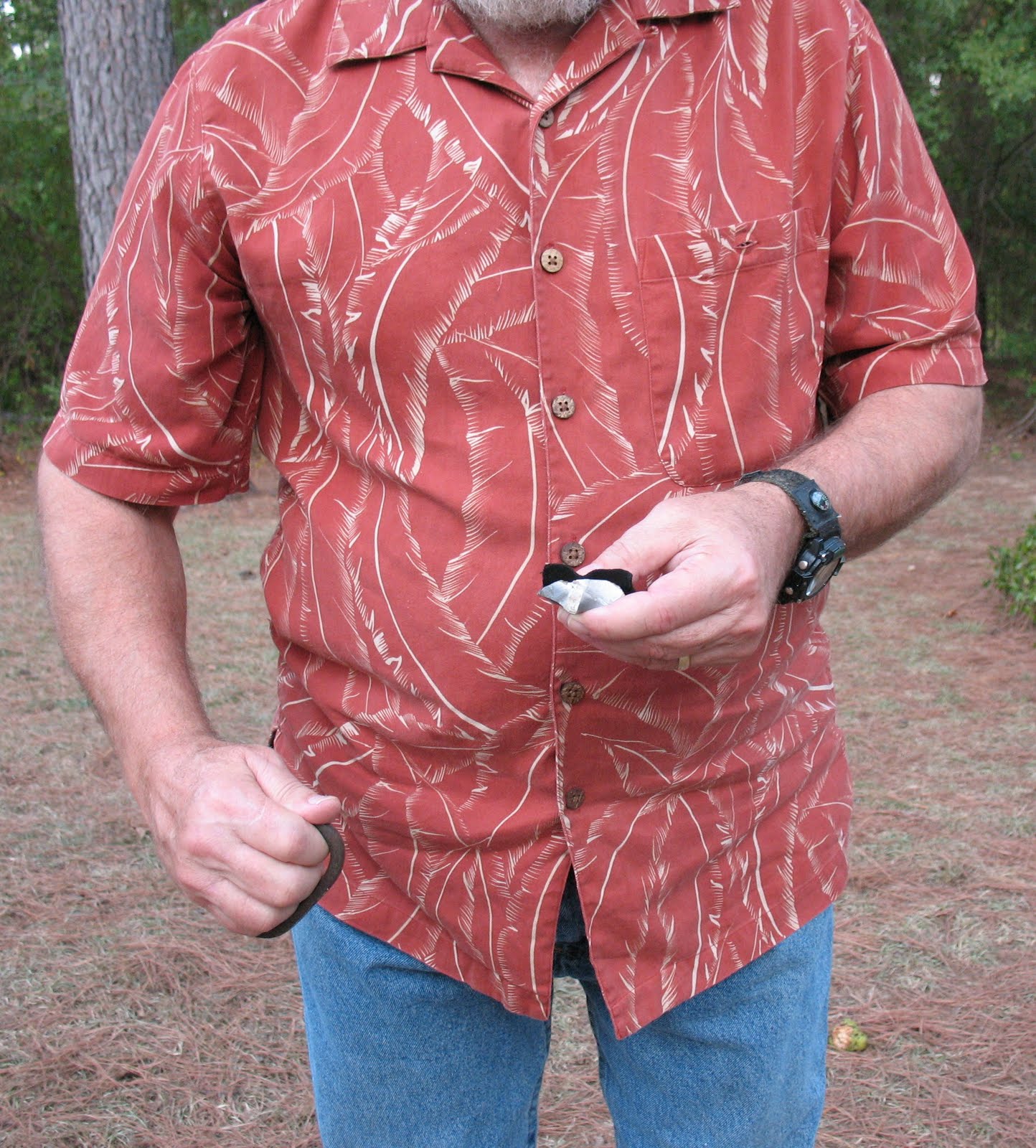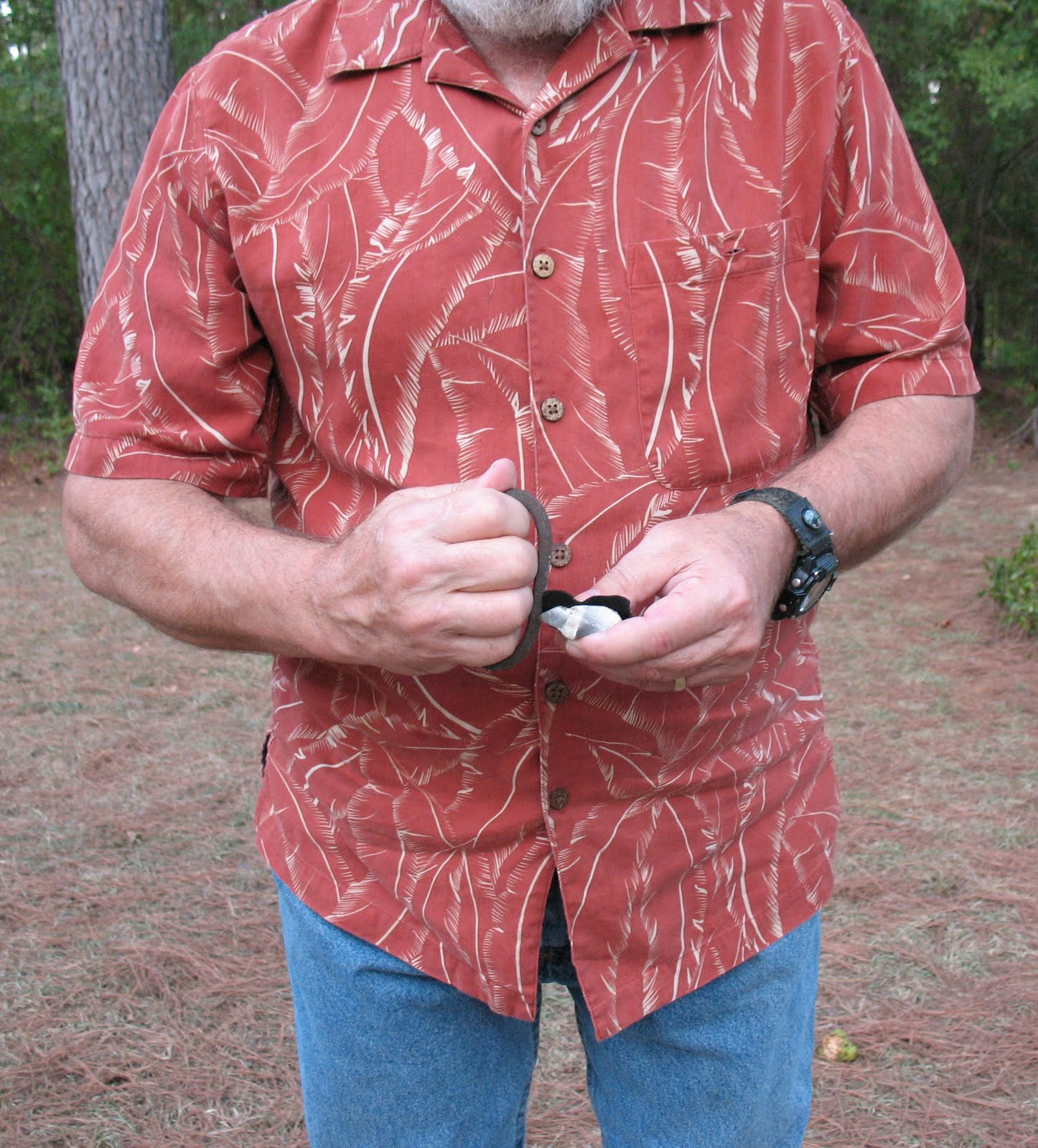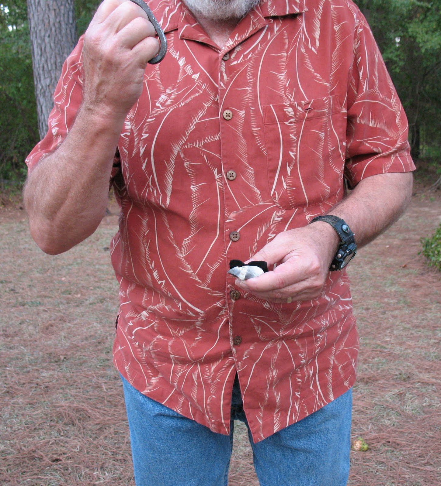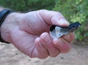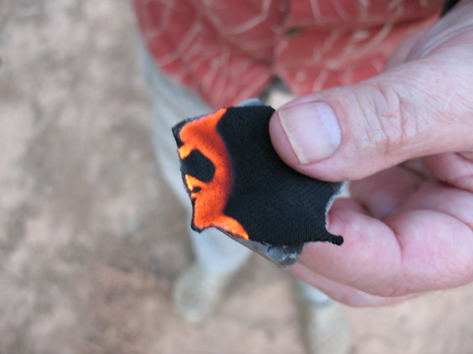 Now take your flint and hold it in a tight pinch grip in your left hand with your thumb on top (these instructions are for a right handed person). Take a piece of char-cloth and place it on top of the flint. Position one edge of the char-cloth directly over the striking edge of the flint and hold the char-cloth in place with your left thumb. Don’t get you thumb too close to the striking edge, or you may hit it with the steel when you are striking. Pictured below: top, how to hold the flint; bottom, char-cloth held beneath thumb.