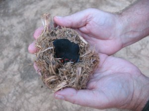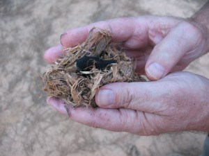 Your char-cloth is now burning. Don’t panic and get in a hurry. The char-cloth will keep burning until you put it out or it all burns up. Calmly pick up your tinder bundle and lay the char-cloth on it. Gently fold the tinder bundle up around the char-cloth so that the tinder is in light contact with the char-cloth. Now blow gently into the bundle to so that the oxygen in your breath will cause the char-cloth to burn hotter. Don’t hold the bundle too close to your face or you may get singed when it ignite. Pictured below: top, char-cloth in tinder bundle; middle, tinder wrapped up around burning char-cloth; Bottom, blowing gently on tinder and char-cloth. Note that the tinder is starting to smoke.