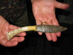 A good example is the knife carried by the “Ice Man”, a late stone-age man who was found frozen in a glacier in the Italian Alps. The Ice Man knife had an overall length of five inches. It is described as looking like an “arrowhead” that has been wedged into a split wooden handle and secured with animal sinew. Pictured below: The Ice Man’s knife.