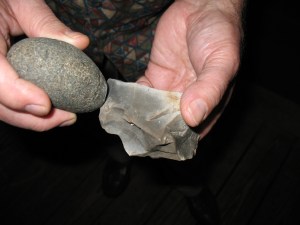 To make a flake blade you will need a fist size piece of flint and another rock to hit it with. Your striking stone, called a hammer stone, should not be flint because it will shatter. Most sandstone is not very good because it is too soft. I like to use a granite river rock. Sometimes they break, but they usually won’t shatter and throw rock splinters into your eyes. Needless to say when you are practicing this skill you should always wear safety glasses. Pictured below: Hammer stone and piece of flint.