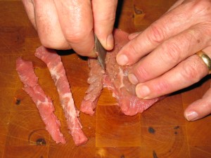 Be careful. The edge of this flake is sharper than a razor blade. Pictured below: Using a flake blade to slice meat.