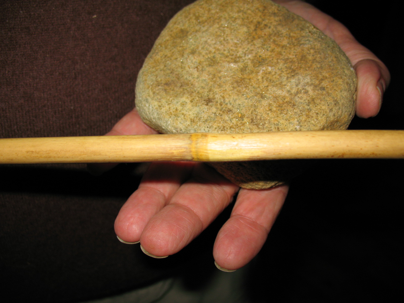 There are occasions when you may need to smooth out a surface and a scraper won’t do the job. You might, for example, be trying to remove the joint ridges from a cane arrow shaft. If you use a scraper to do this you will find that the scraper wants to remove material from the area between the joints as well as from the joint ridges. If you use a sandinging stone you will be able to sand the ridges down so that they are even with the surrounding material, and you will end up with a nice smooth arrow shaft. Pictured below: top, sanding stone and cane shaft with rough joint; middle, using sanding stone on joint; bottom, sanding stone and smoothed out cane joint.