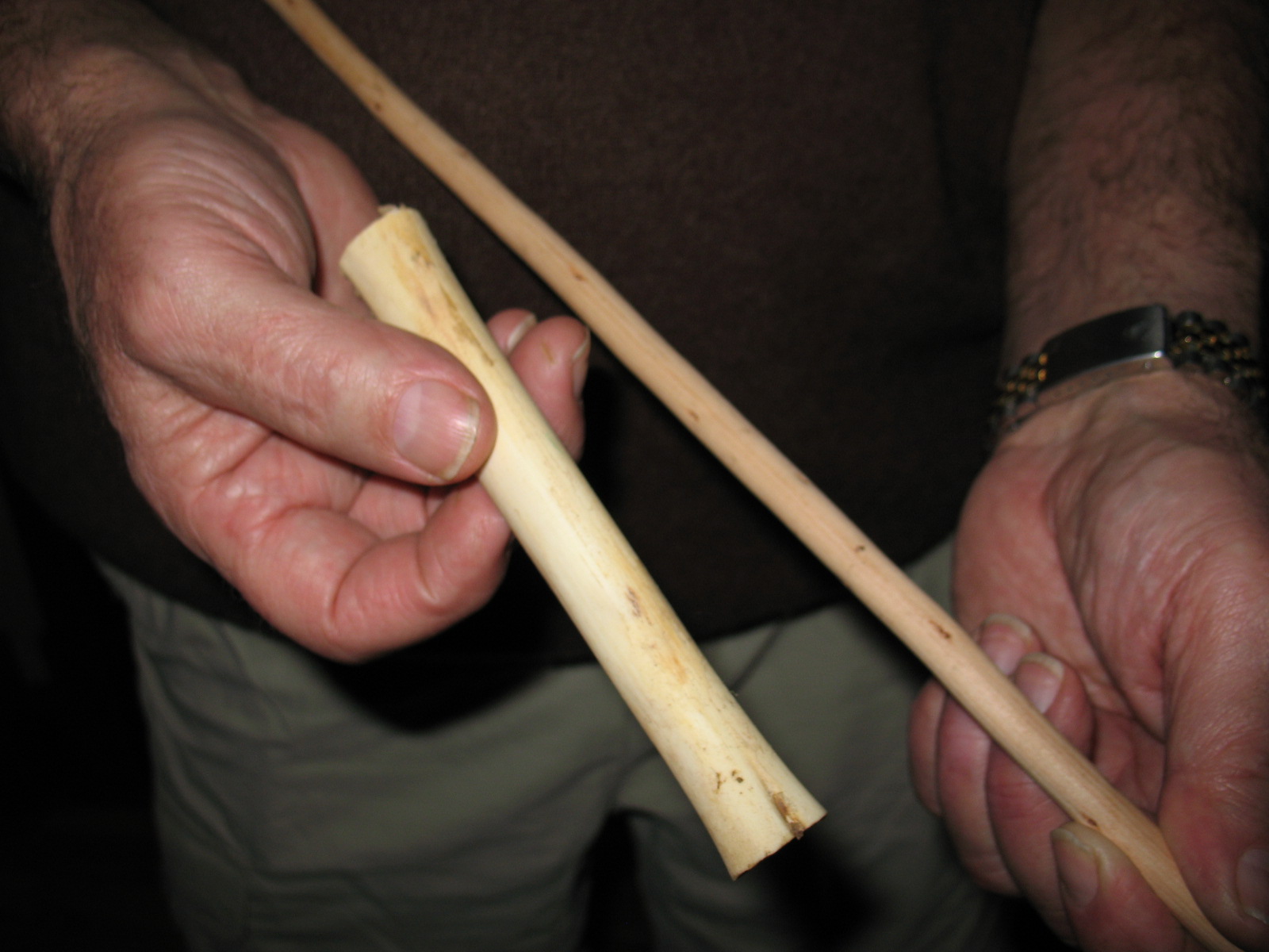 Sometimes you will want to give a very smooth and hard surface to something that you are making, like a hardwood arrow shaft. You can achieve this super smooth and hard finish by a process called “burnishing”. A piece of smooth bone is one of the best burnishing tools that you can use. If you can find a good deer leg bone, that’s all you will need. You don’t have to modify the bone in any way. Pictured below: Deer leg bone and hardwood shaft.