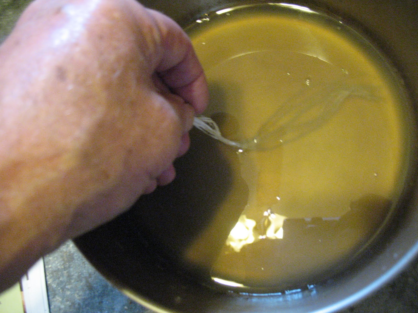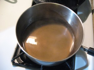 Here’s how you do it. Bring a gallon of water to a rolling boil. After the water comes to a good boil, reduce the heat so that the water is just simmering. Take a double handful of rawhide shavings and drop them into the water. Stir the shavings around a little then set back and let them simmer. Keep an eye on the water and don’t let it all boil away. If it gets down below an inch add some more water. The shavings will eventually begin to dissolve. When they are completely dissolved, let the water boil down until you have about an inch in the pot. Pictured below: Rawhide glue after about twenty hours at a low simmer. The water had to be topped up about six times.