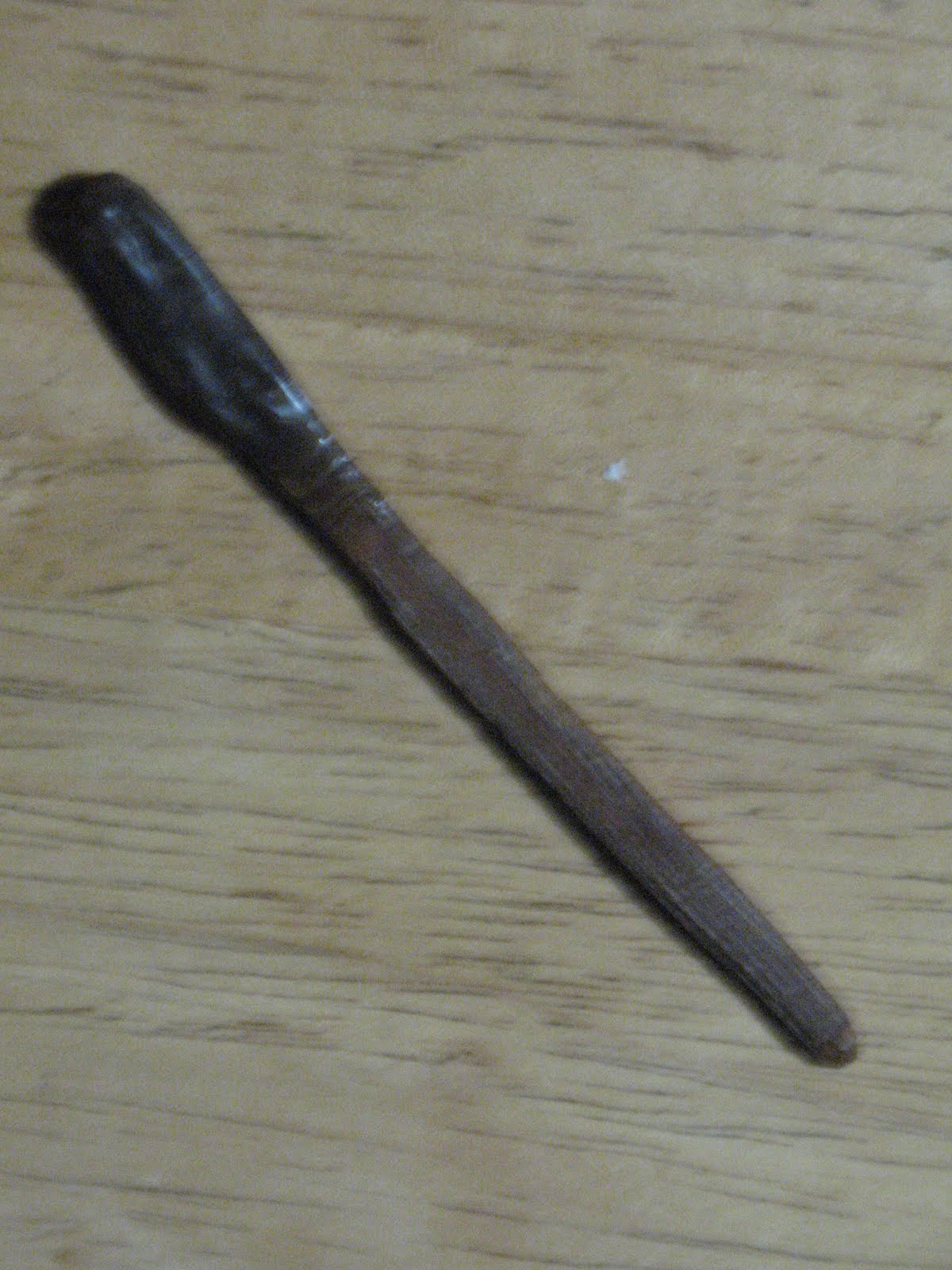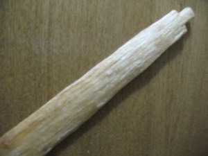 If you leave the glue on the stove longer, until most of the water is boiled away, it will become very hard and brittle. In this condition the glue will keep for years without refrigeration. You can take very thick rawhide glue and before it cools dip a small stick into. Swirl the stick around a little to get a good glob of glue on it, then stick the stick into the ground in an upright position and let the glue dry. You’ve just made a Stone Age glue stick. Native Americans often carried a glue stick like this to make repairs to arrow point bindings or fletchings. Just lick the glue stick or put it in your mouth for a moment and it will soften up for use. Pictured below: Rawhide glue stick.