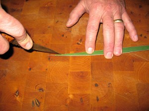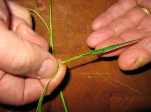 Use your fingers to strip off the fibers on the outside edges of the leaf. Pictured below: Stripping of the outside fibers.