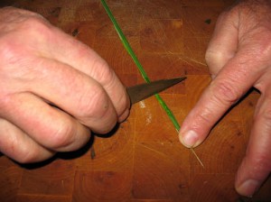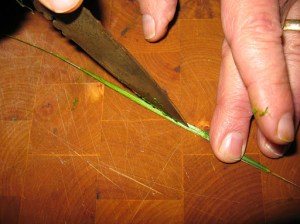 Use your knife and starting about an inch-and-a-half below the needle scrape off the waxy outer layer of the leaf. Pictured below: Scraping of the waxy outer layer.