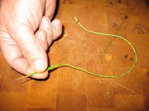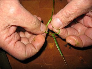 Starting about an inch and a half below the point of the needle, split the exposed yucca fibers into two strand and twist these strands together to form your thread. Pictured below: top, Splitting the fibers with a knife; middle, separating the fibers into two strands with the fingers; bottom, Twisting the strands into thread.