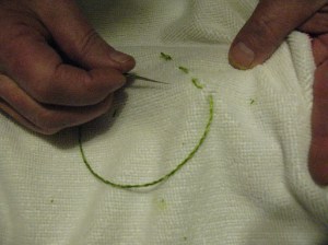 You should now have about a foot to foot and a half long thread with a needle attached to it. The needle will easily penetrate cloth. If you are going to sew leather or canvas you will probably have to use an awl to punch holes in the material first. Pictured below: top, Finished needle and thread; bottom, sewing cloth with the yucca needle and thread.