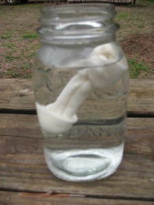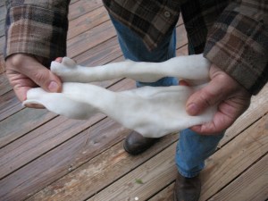 The next morning it will be soft and pliable. Untie the knots in the ends and unroll the wet rawhide. You won’t have a big sheet of hide like if you made your own, and it won’t have that nice brown color, but it is big enough to cut into thongs for attaching an axe head or a spear point. Pictured below: top, Chew bone just removed from water; bottom, this chew bone was made of two small pieces of rawhide.